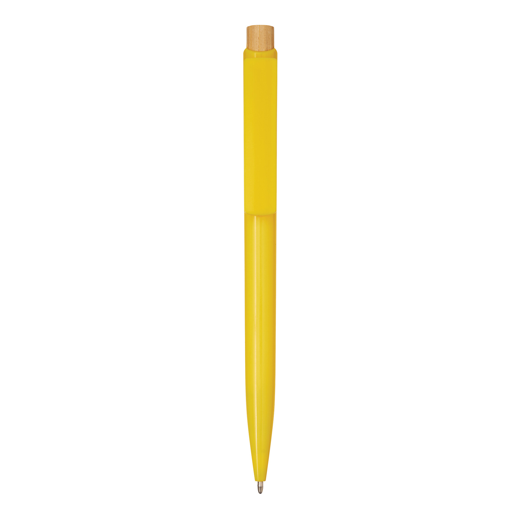 Bolígrafo BAPU: cuerpo de plástico reciclado, mecanismo de pulsación, pulsador de bambú, tinta azul