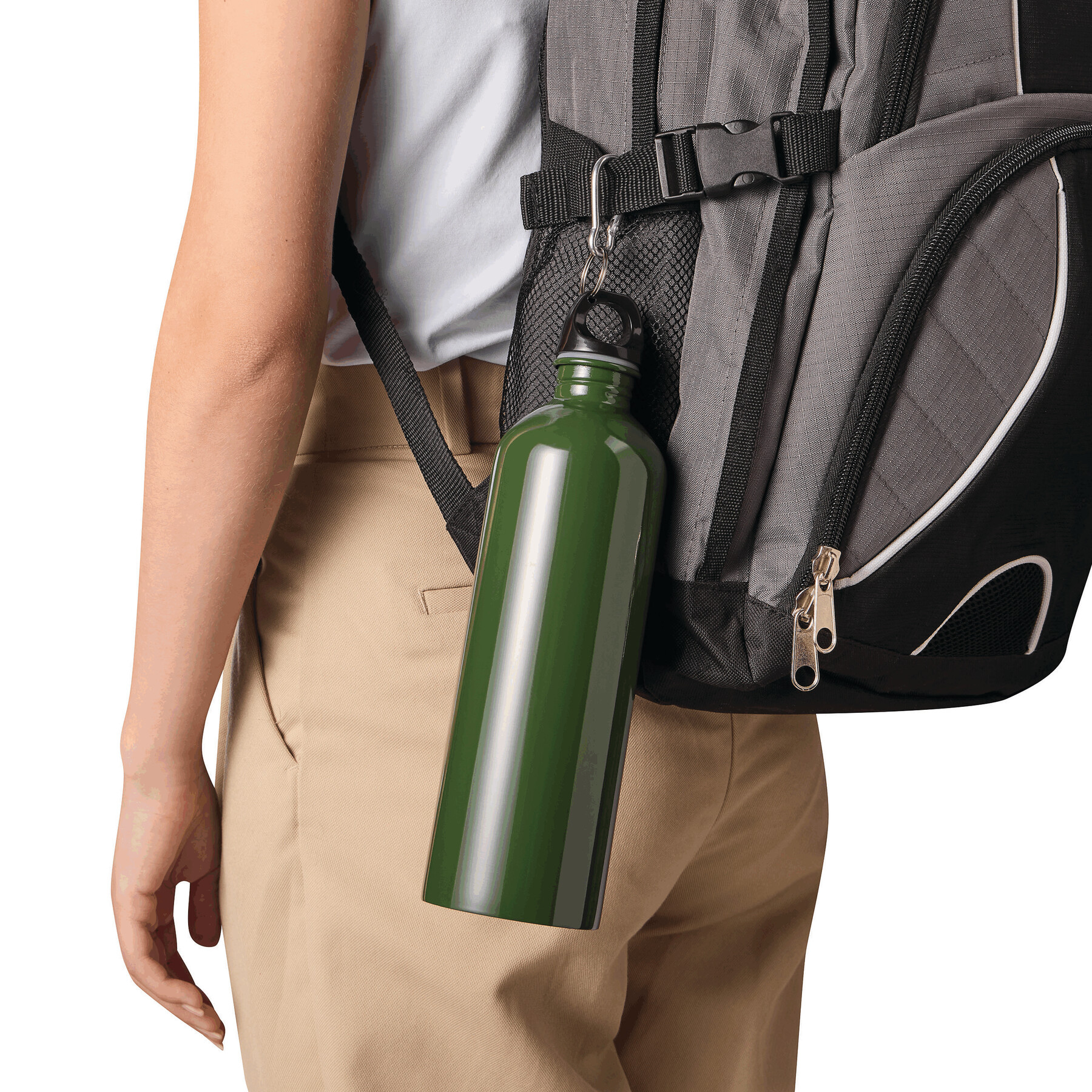 Botella de acero inoxidable STEELTRANSIT, de pared simple: fabricada en acero inoxidable reciclado, tapón de rosca negro de plástico, junta de silicona, asa de transporte, llavero y mosquetón (el mosquetón NO es apto para escalada), capacidad aprox. 750 ml