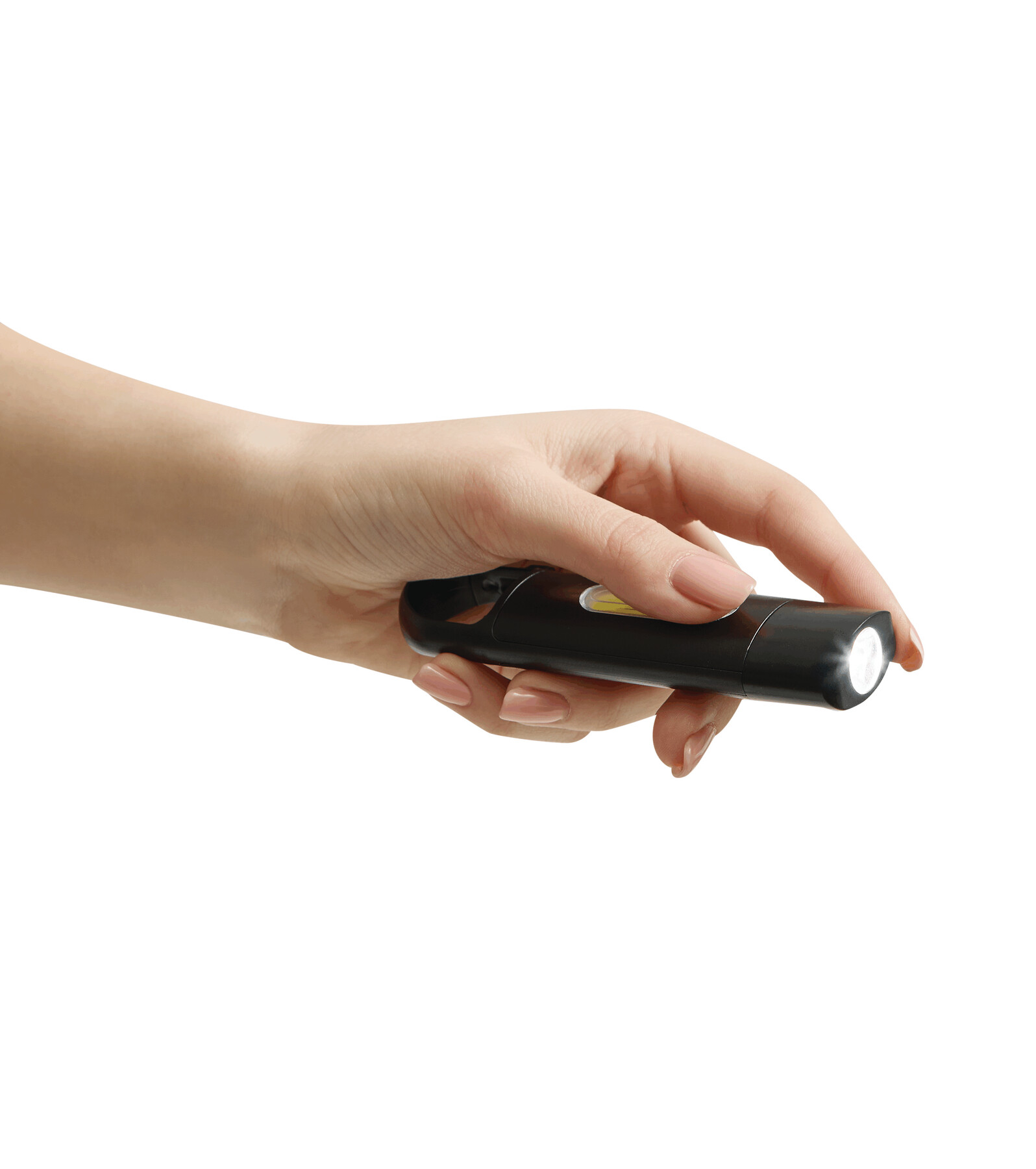 Linterna recargable BRIGHT LIGHT: LED frontal con 3 modos de luz (100 %, 75 %, intermitente), campo COB con 10 potentes LED en la parte superior, potente batería de litio (200 mAh), incluye cable de carga USB con conector tipo C (aprox. 30 cm), con mosquetón (no apta para escalada), interruptor de encendido/apagado, en caja