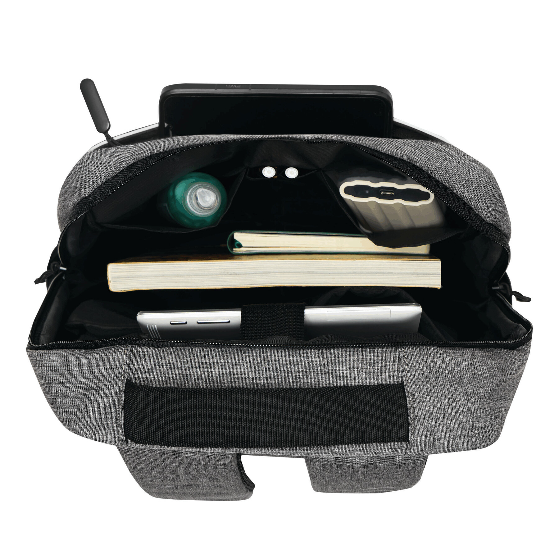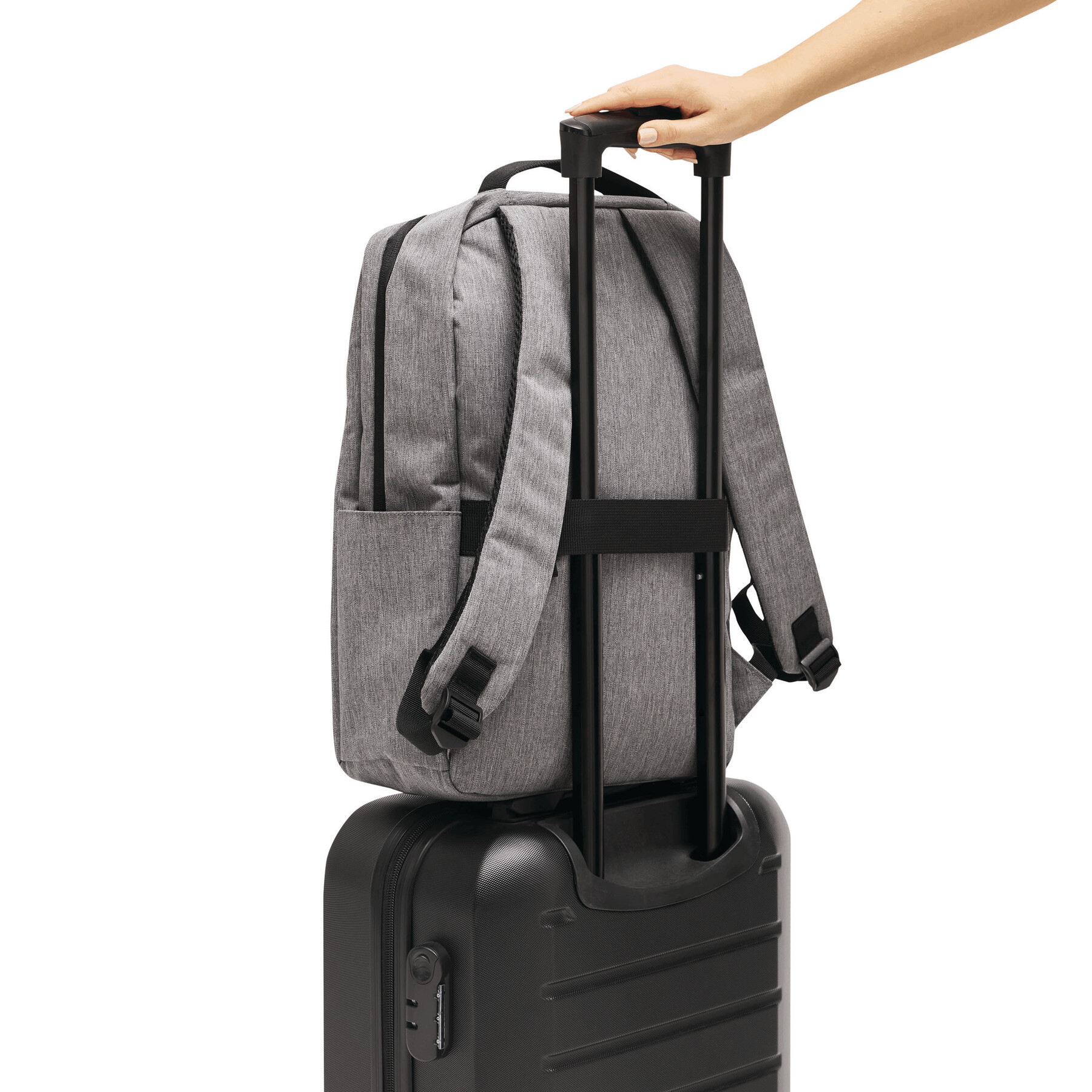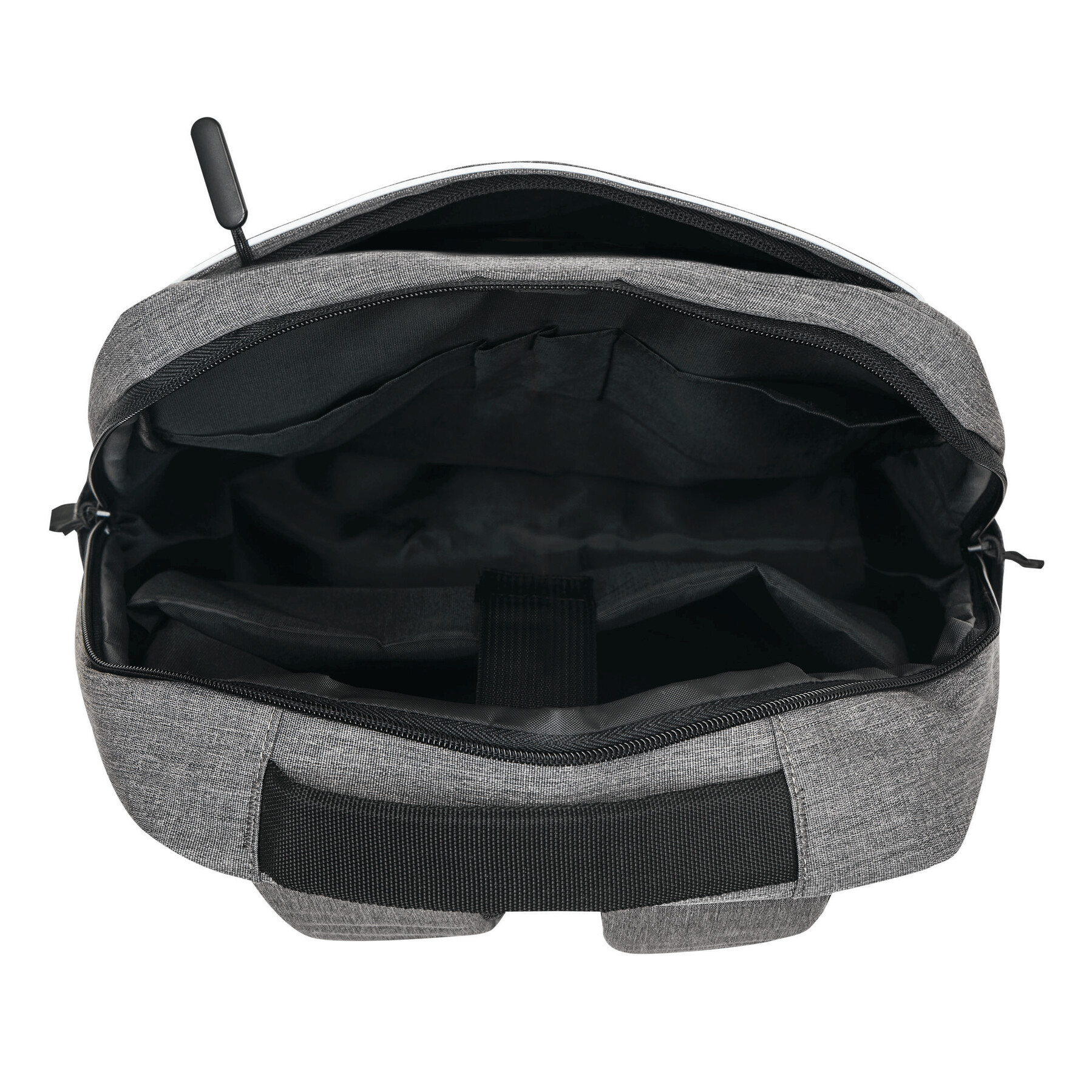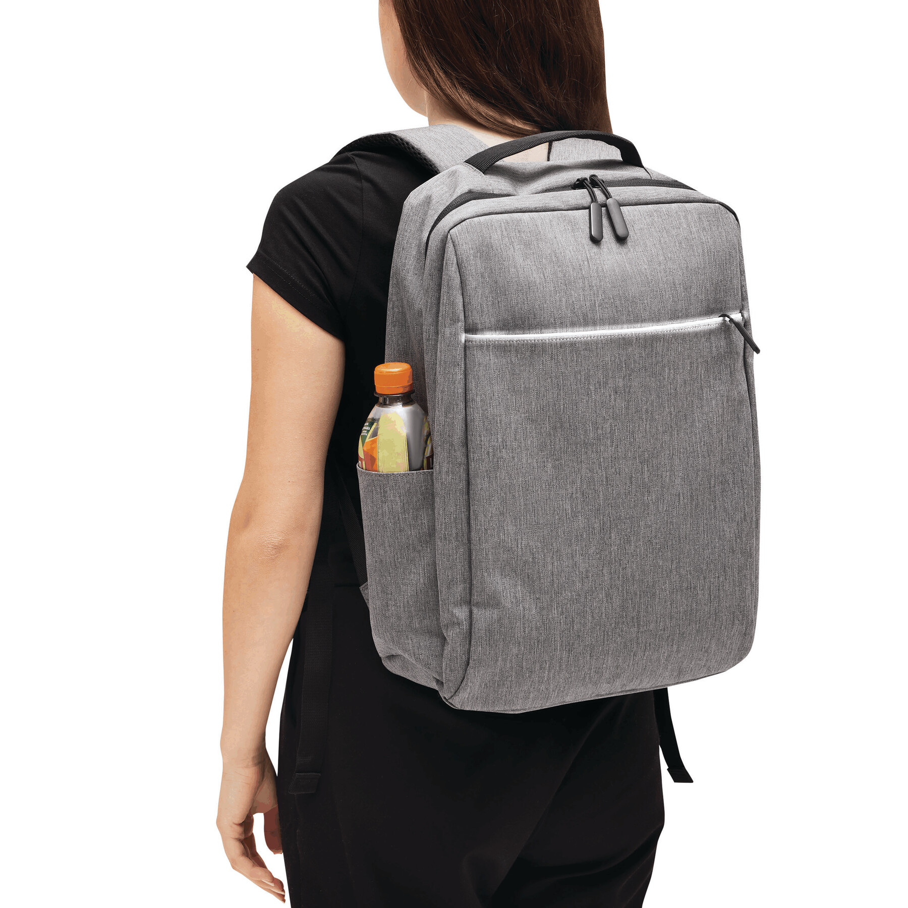 Mochila GHENT: fabricada con poliéster reciclado (rPET), 1 compartimento frontal con cremallera y tira reflectante, compartimento principal con cremallera y funda interior acolchada para portátil o tablet, organizador con 4 bolsillos abiertos, 2 bolsillos laterales, asa de transporte acolchada, correas de hombro acolchadas y ajustables, correa trasera para función de reportero.