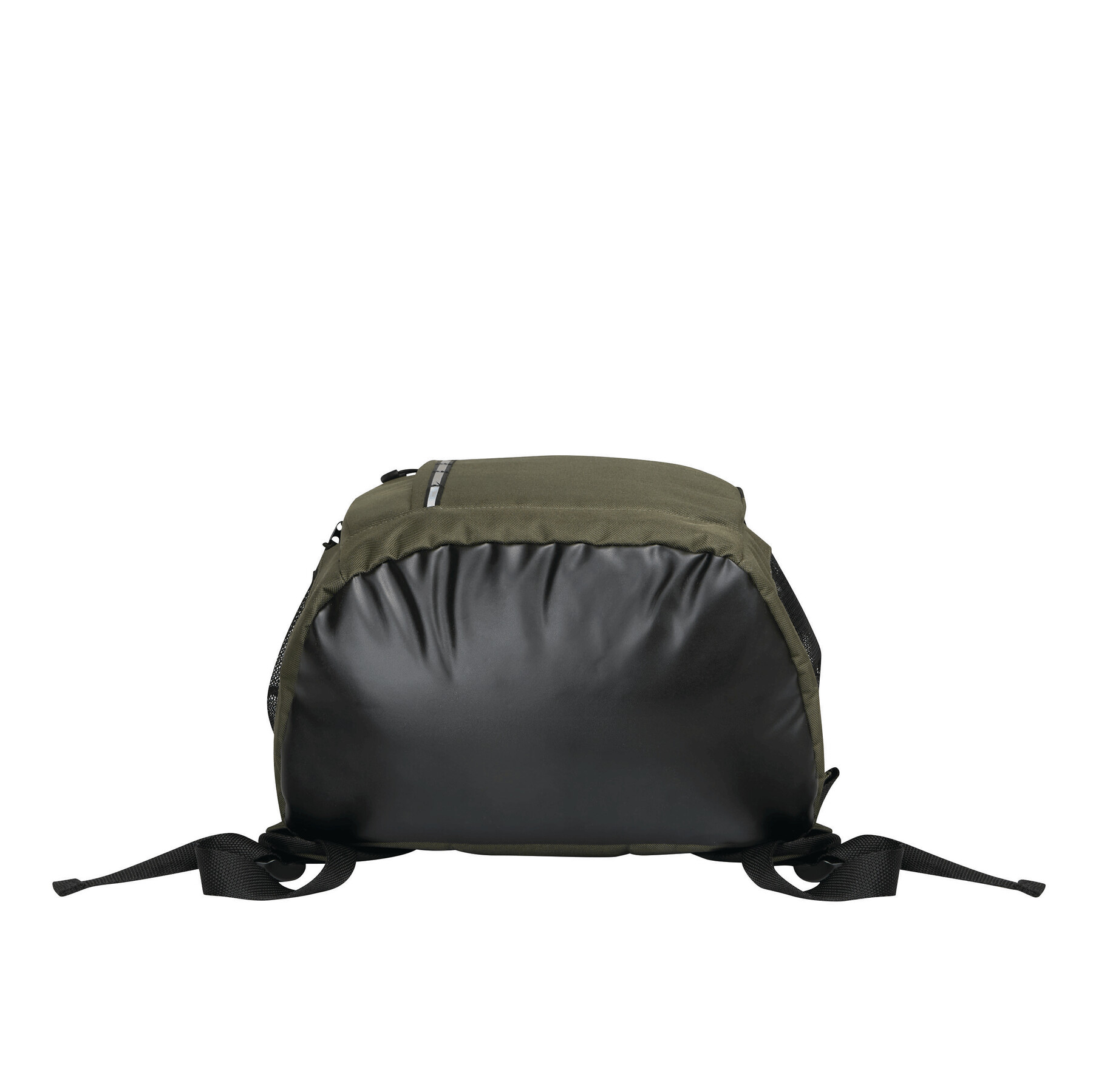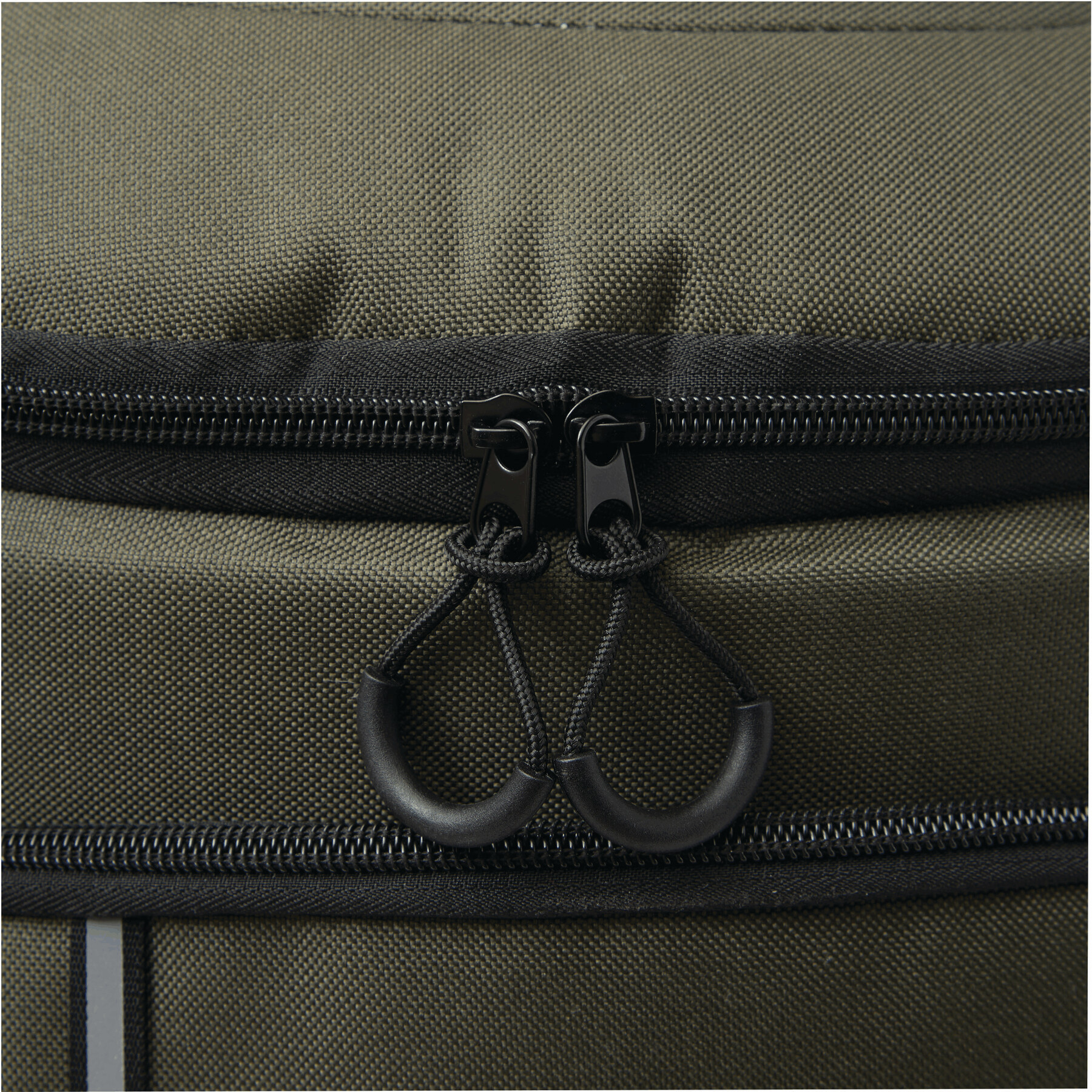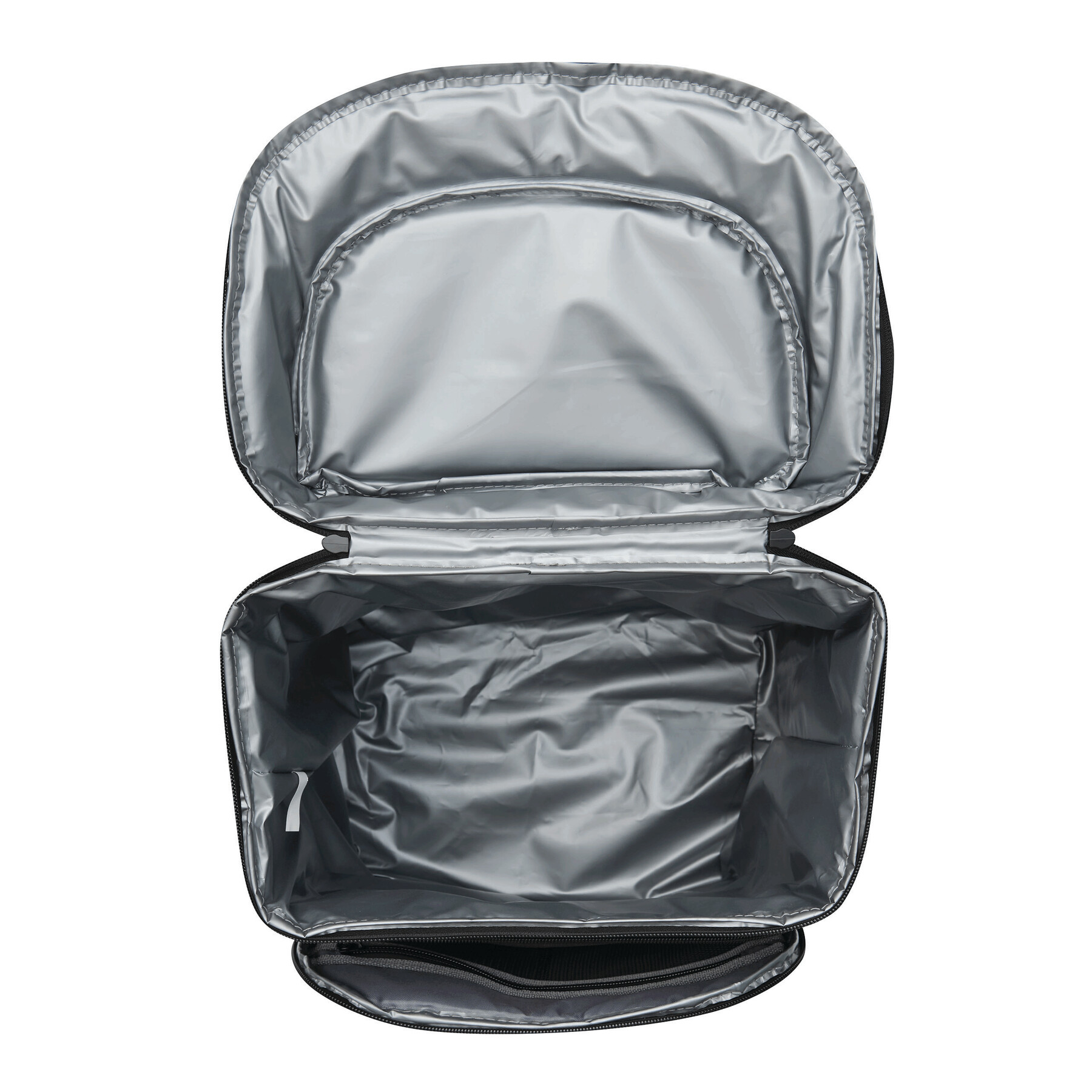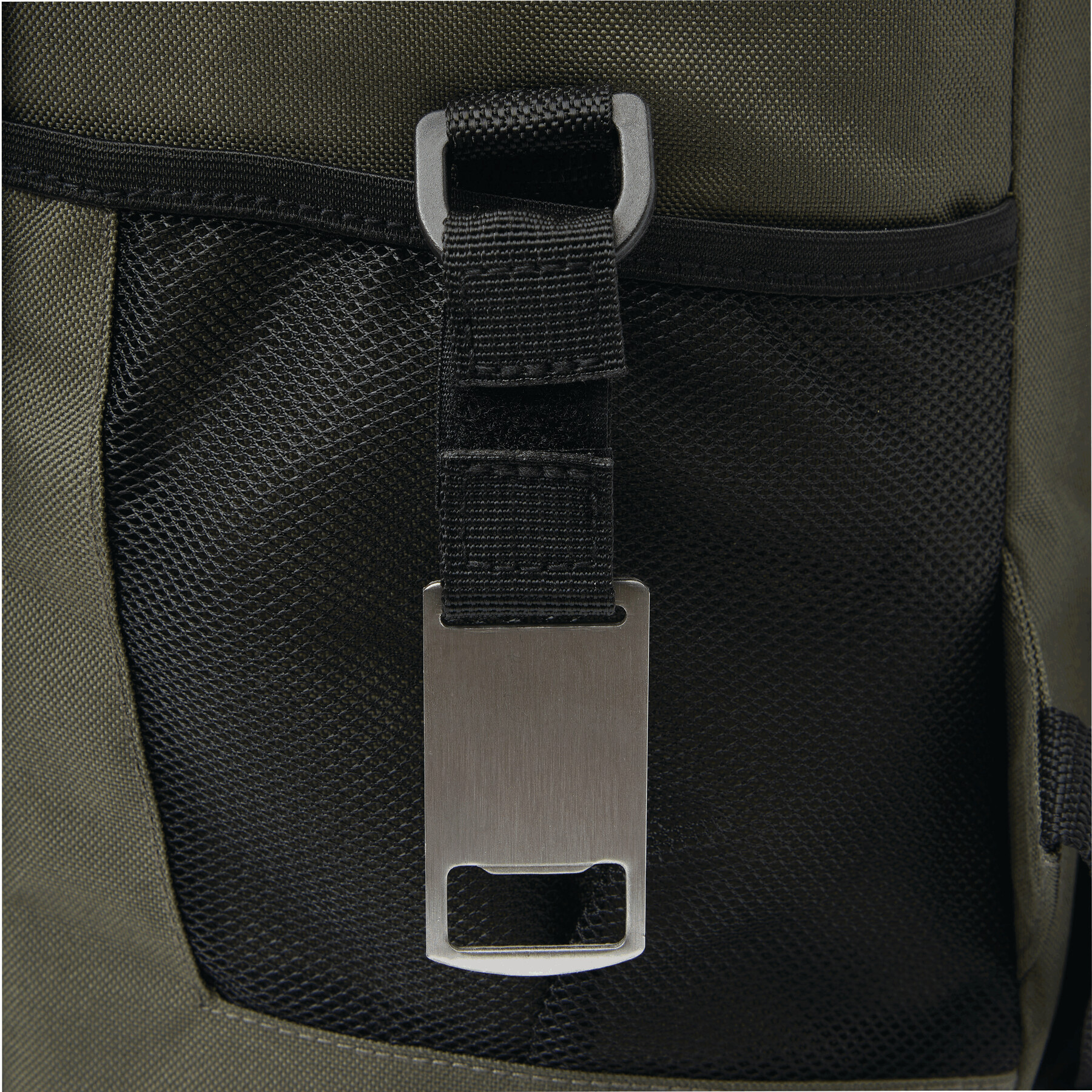 Mochila nevera YUKON: 1 compartimento principal grande con material aislante y cremallera, con forro de PEVA; 1 bolsillo frontal con cremallera y compartimento de malla; 1 bolsillo frontal vertical con cremallera y banda reflectante; 2 bolsillos laterales de malla; 1 abrebotellas extraíble de acero inoxidable; base repelente al agua; correas de hombro acolchadas y ajustables; asa de transporte.