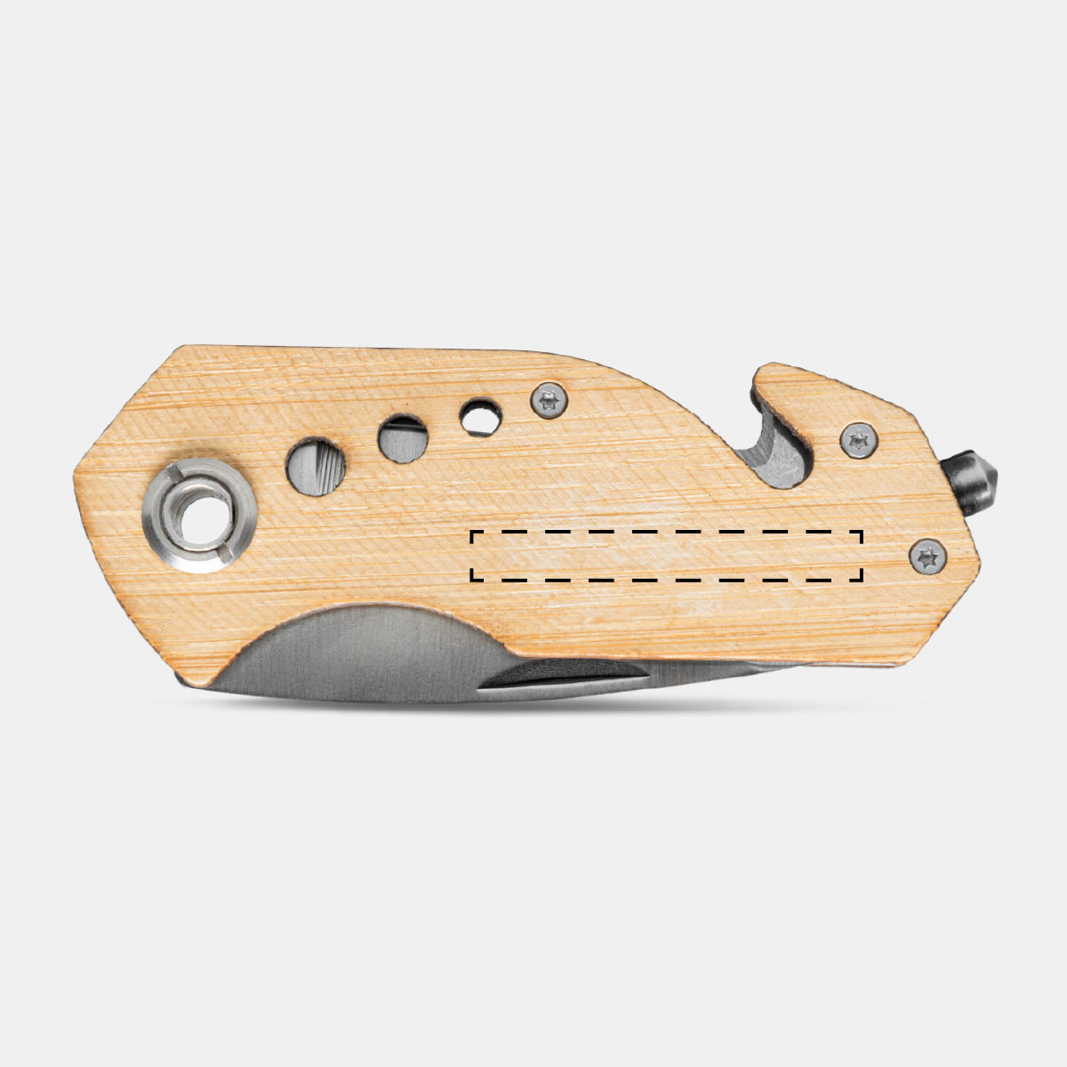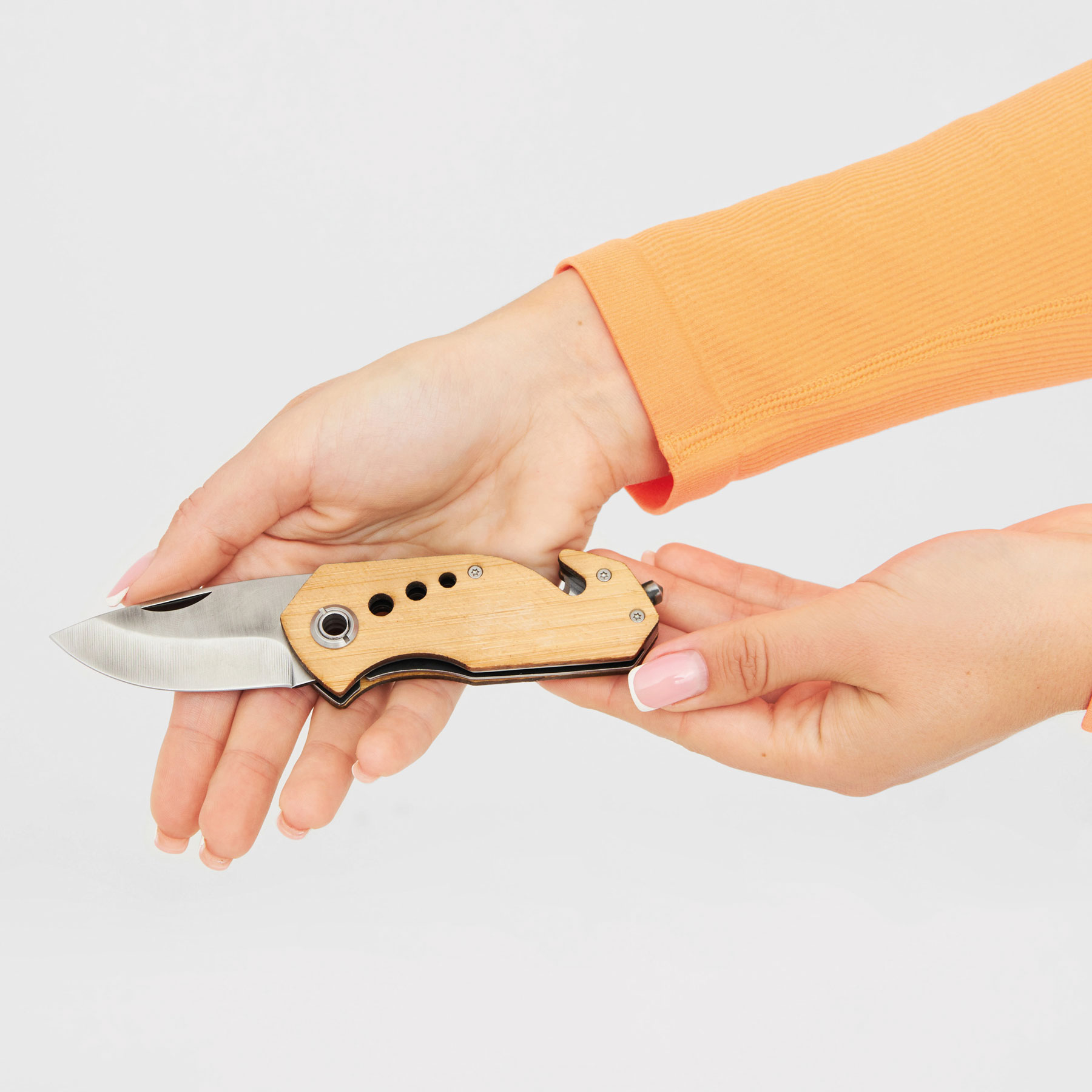 Navaja BAMBOO HIT: plegable, hoja ancha, con cortador de cinturón y martillo de emergencia, clip para sujetar al cinturón, fabricada en acero inoxidable con mango de bambú