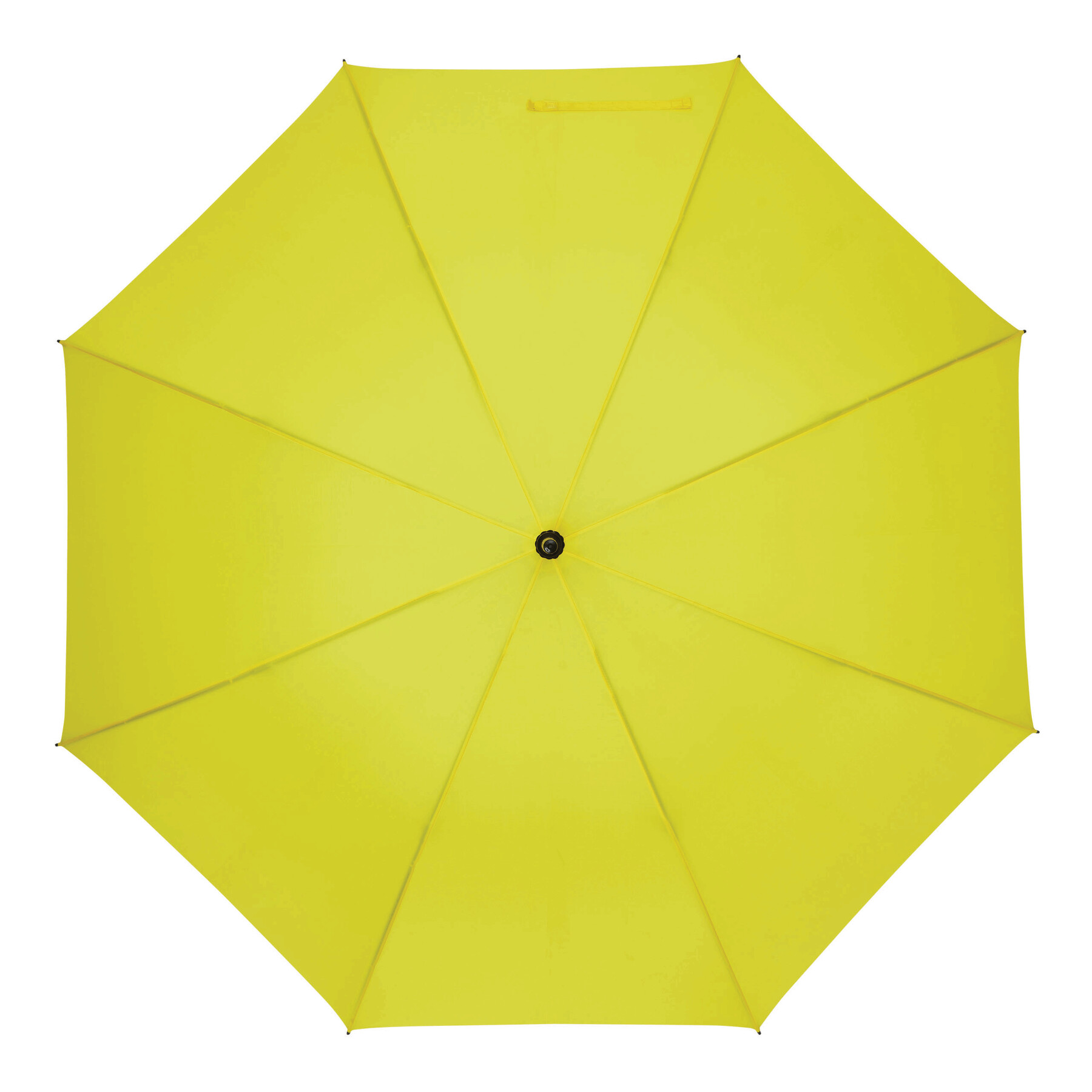 Paraguas de golf automático ORA: con eje y varillas de fibra de vidrio, puntas de plástico, mango de EVA con botón pulsador integrado, revestimiento de poliéster pongee fabricada con plástico reciclado / rPET, correa de cierre con velcro.