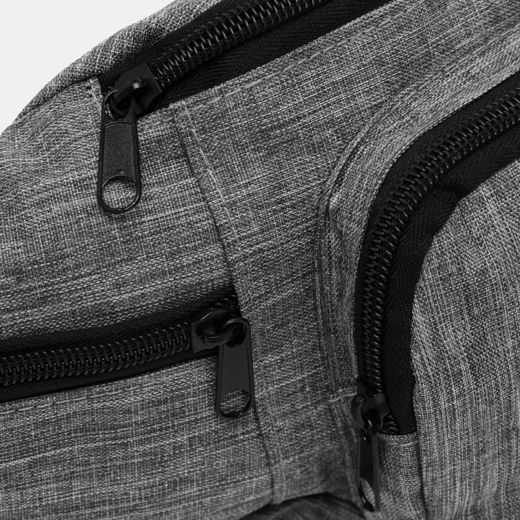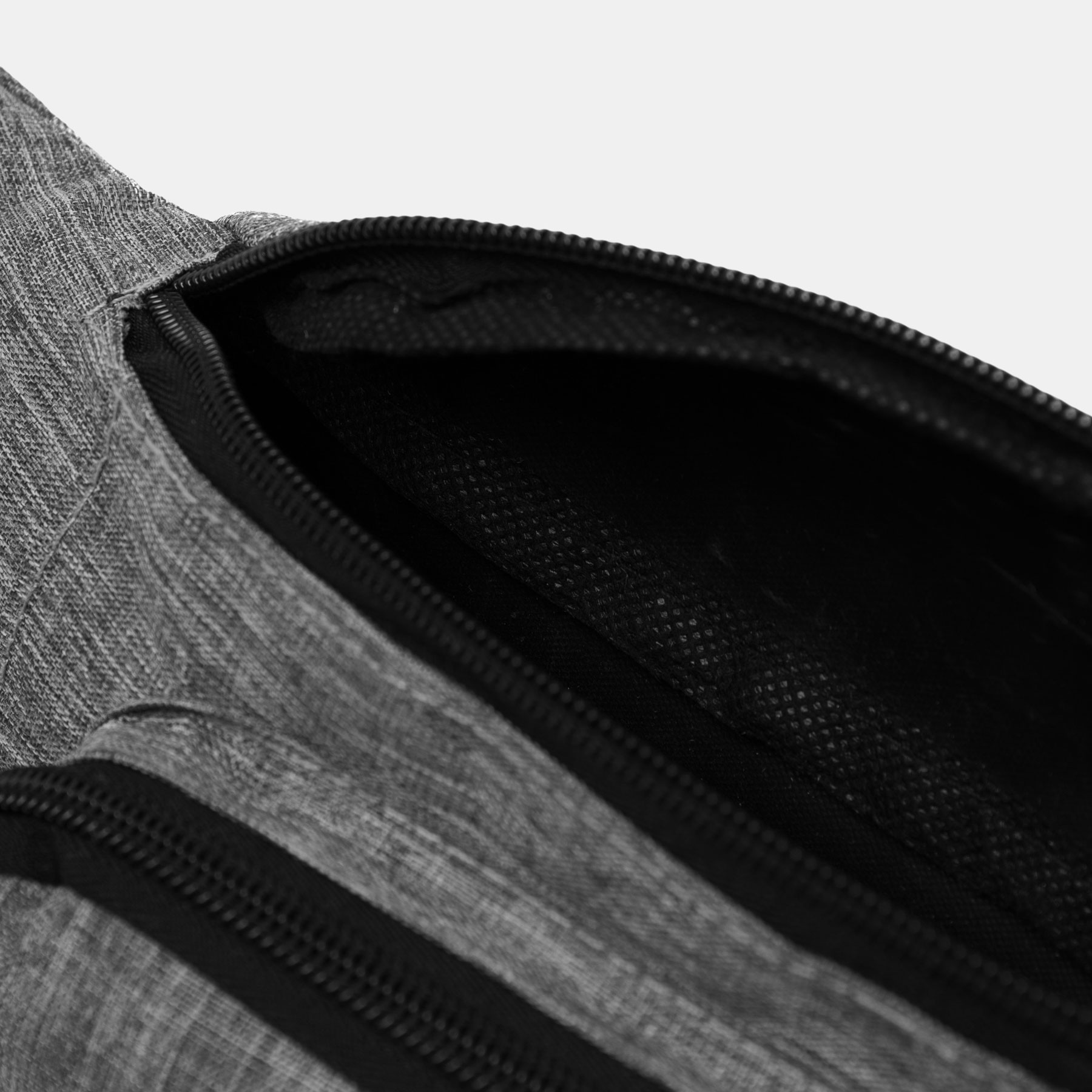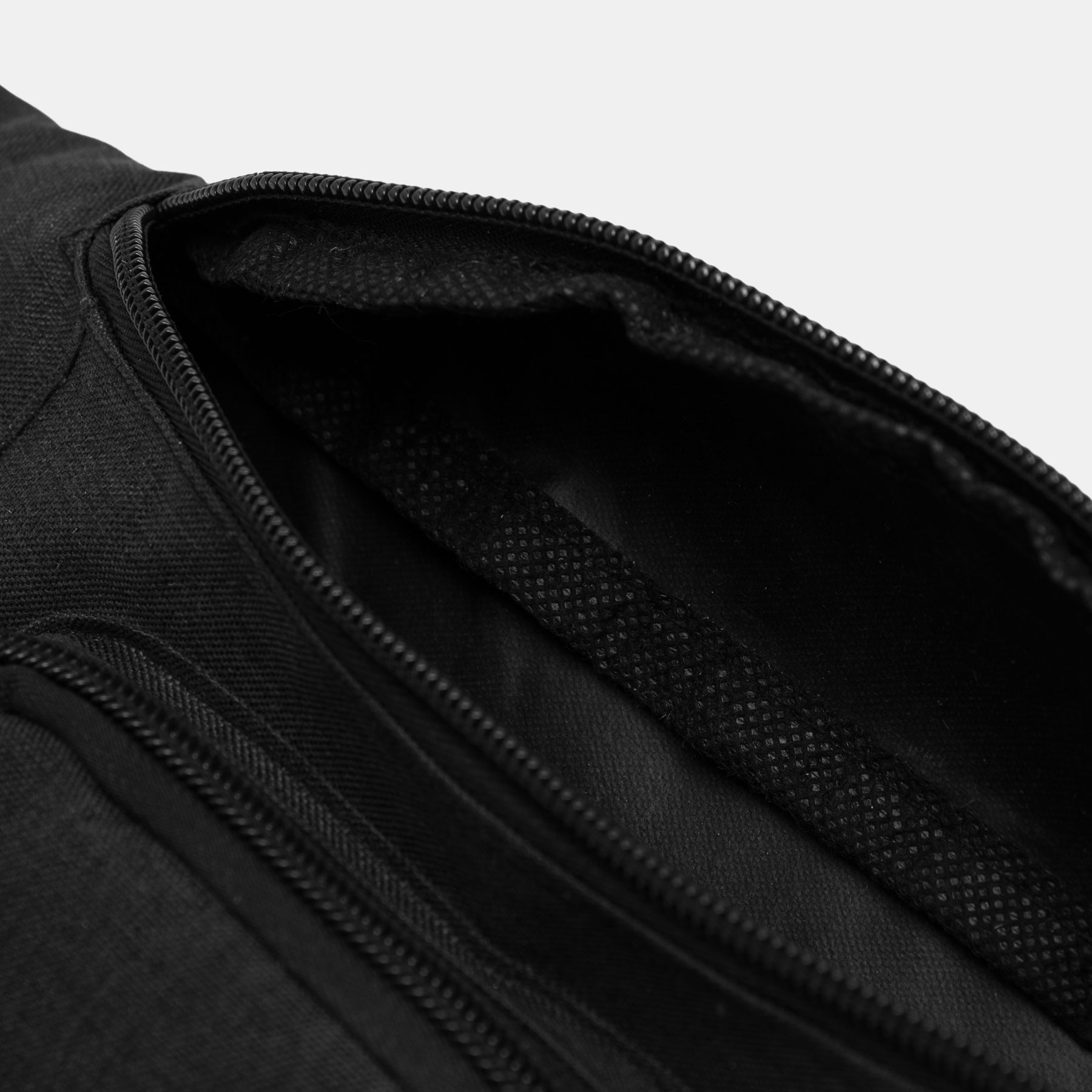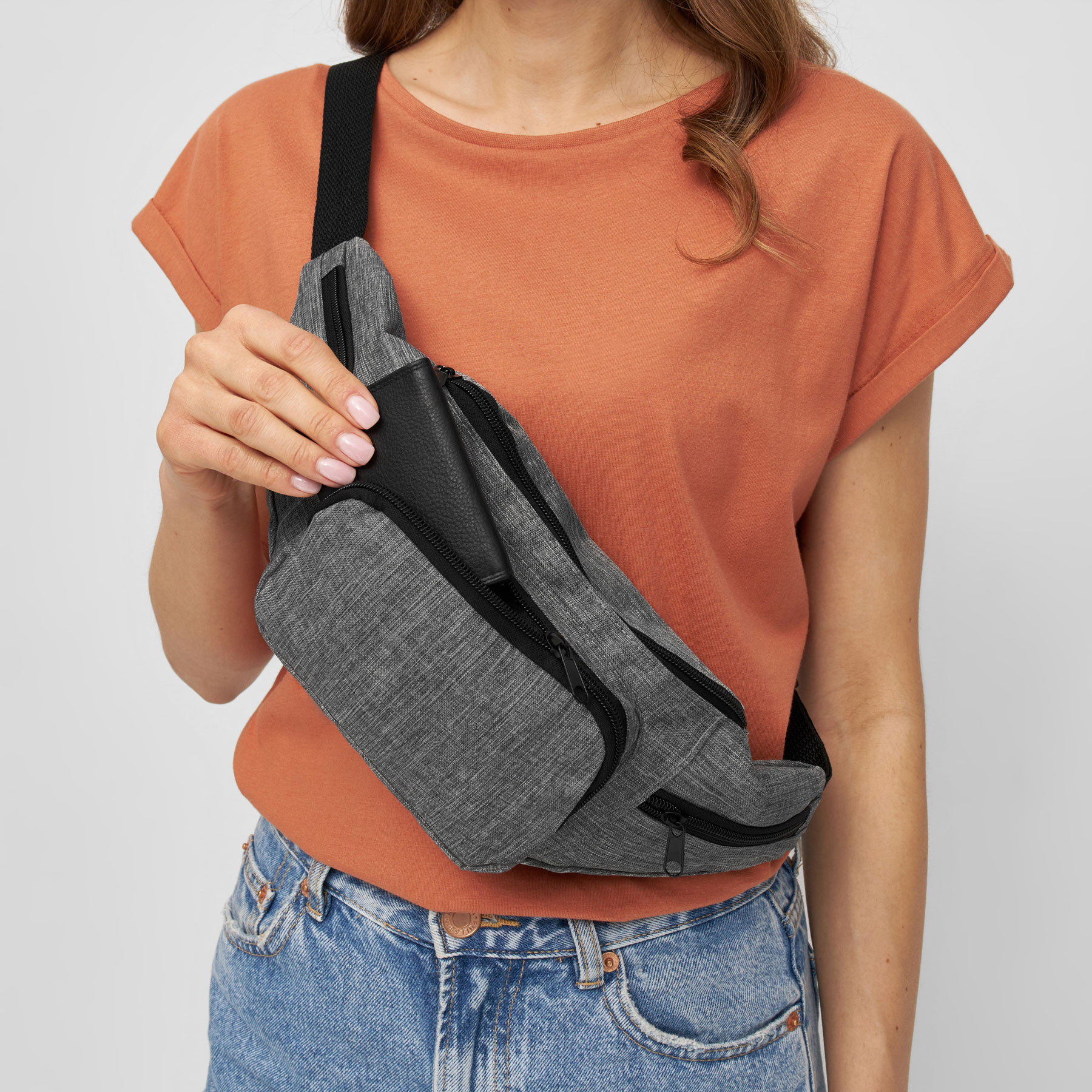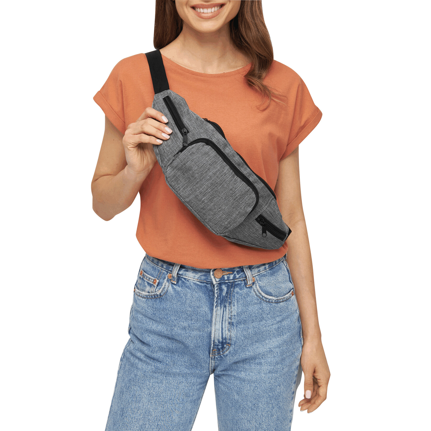 Riñonera QUAD: espacioso compartimento principal con cremallera, 1 bolsillo frontal con cremallera, 2 pequeños compartimentos laterales con cremallera, cinturón ajustable con cierre a presión